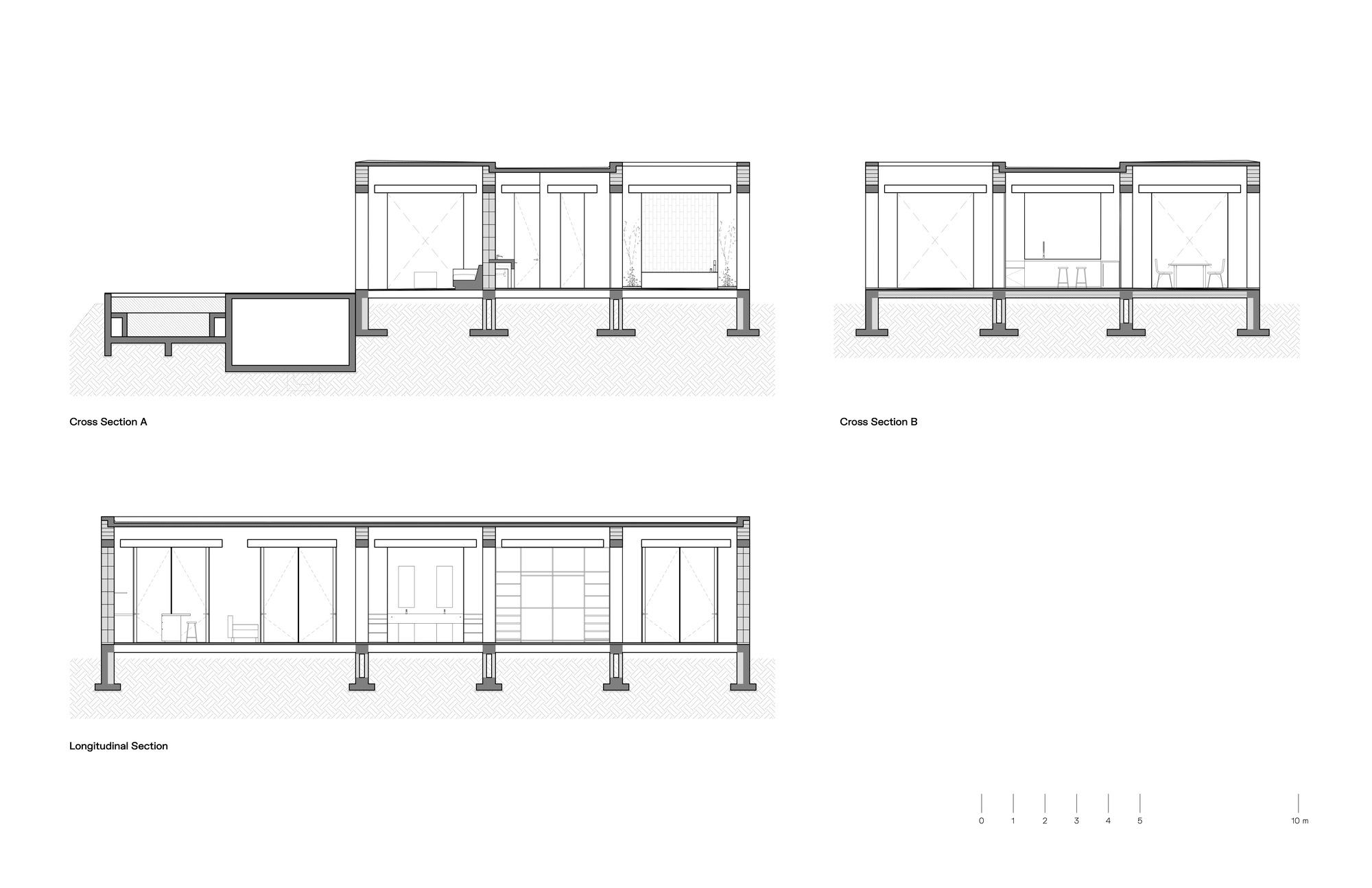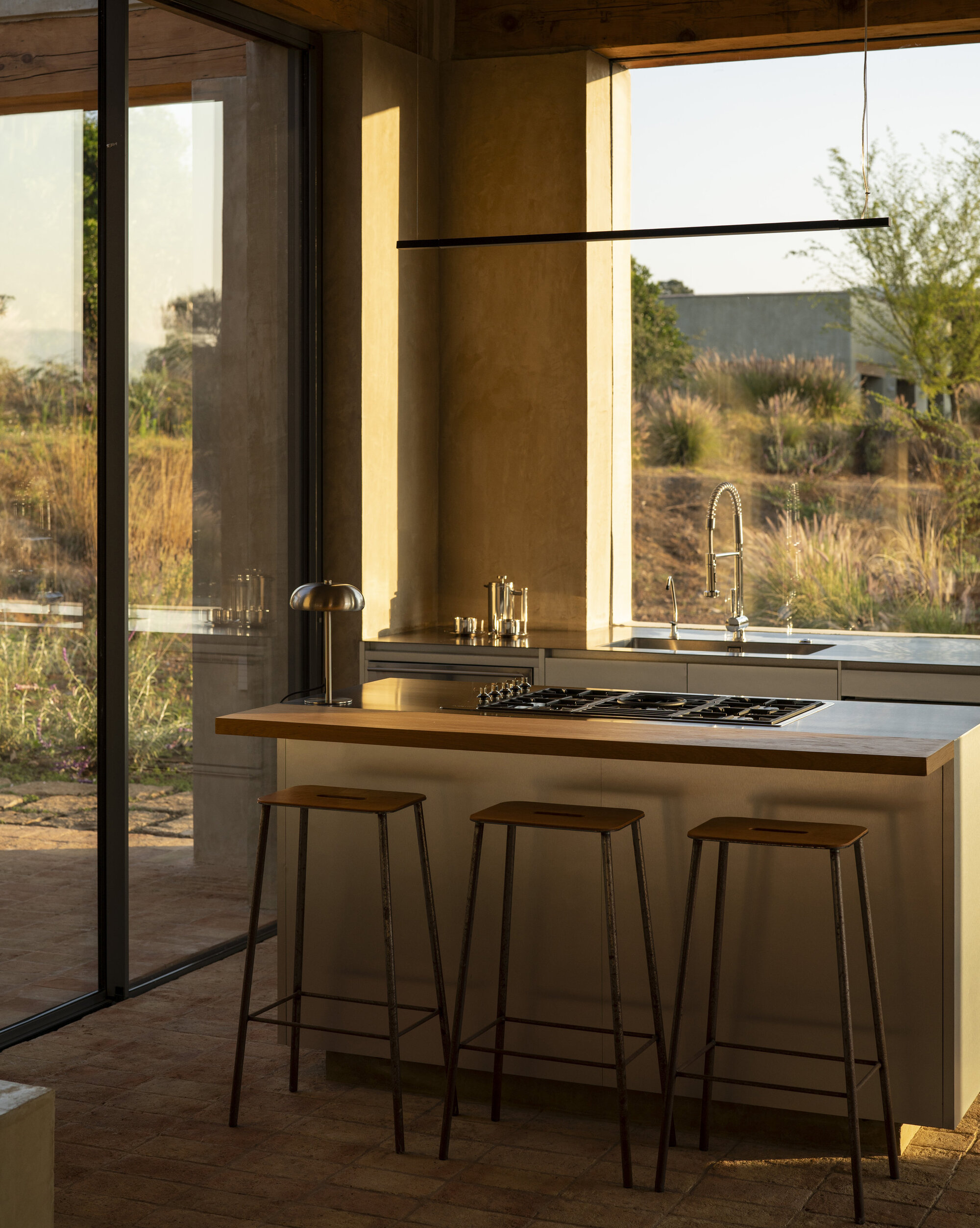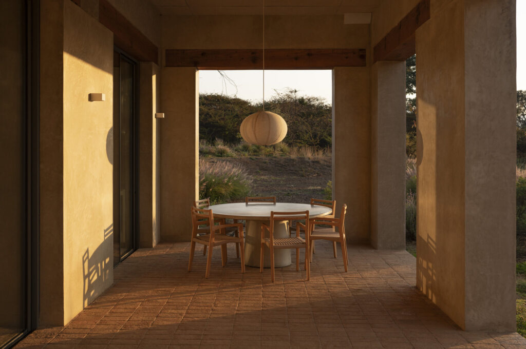 The house acts as a sanctuary for contemplation where nature is centered. Staggered walls and large openings create protection while framing views and letting the landscape pass through the space. This allows natural light and ventilation while maintaining a close and continuous relationship with the outdoors.