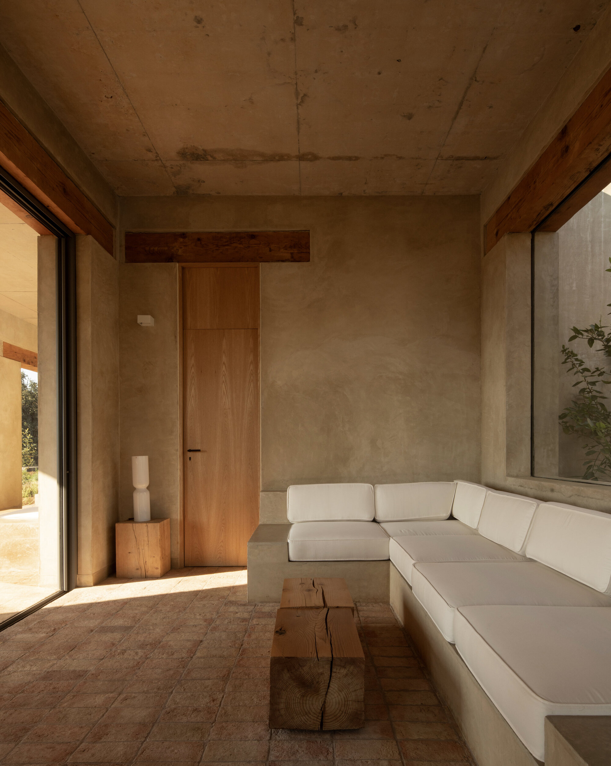 The project was constructed by adobe and wooden beams, which were left exposed to add warmth. The floor was handcrafted with adobe produced on-site, and the walls are finished with an adobe plaster that harmonizes with the surrounding color palette.