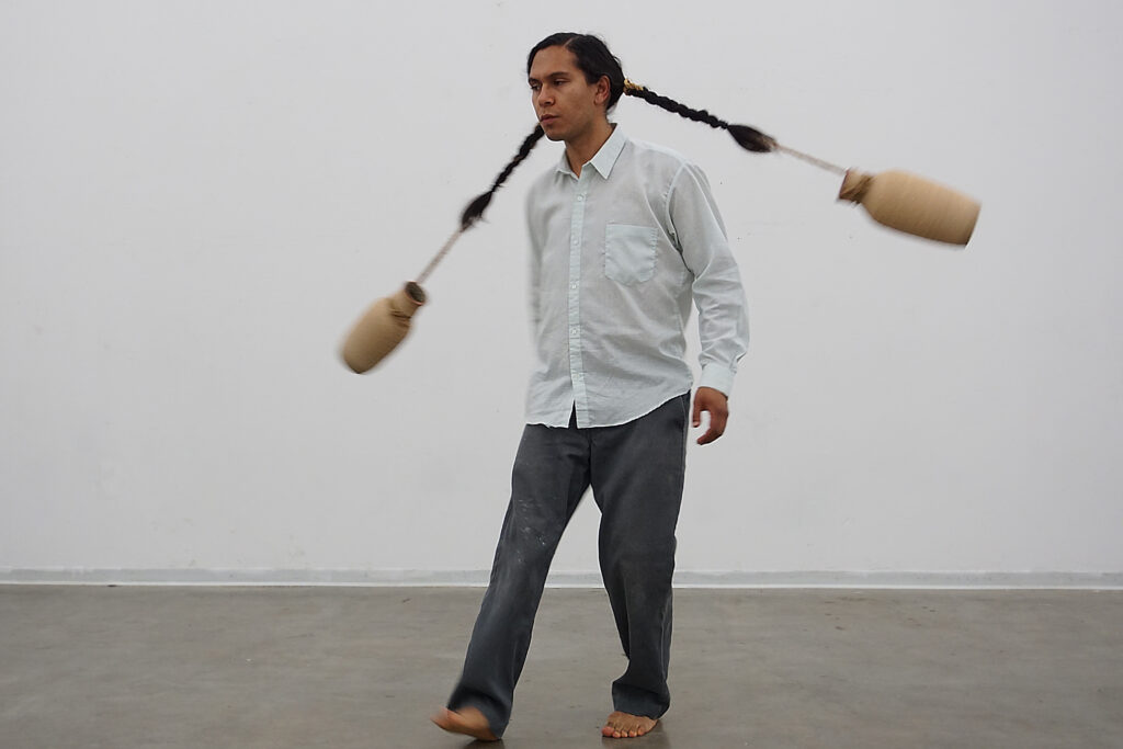 Through blending performance and sculpture, he is able to question the dichotomy between myth and fiction as an antonym to history. Growing up in two worlds has lead Cortés to a fantastical take on the ordinary. He incorporates the multitude of symbols and identities from his family of farmers, migrants, manufacturers, office professionals, and professors in his material palette and choice of dress. In contrasting the mythical or in this case the colorful and culturally rich materiality with his business casual clothing, he illustrates the parallelism and tension within his life and work. This re-assembling of materials and cultural symbolism is crucial to how Cortes seeks to challenging notions of spectacle and viewership.