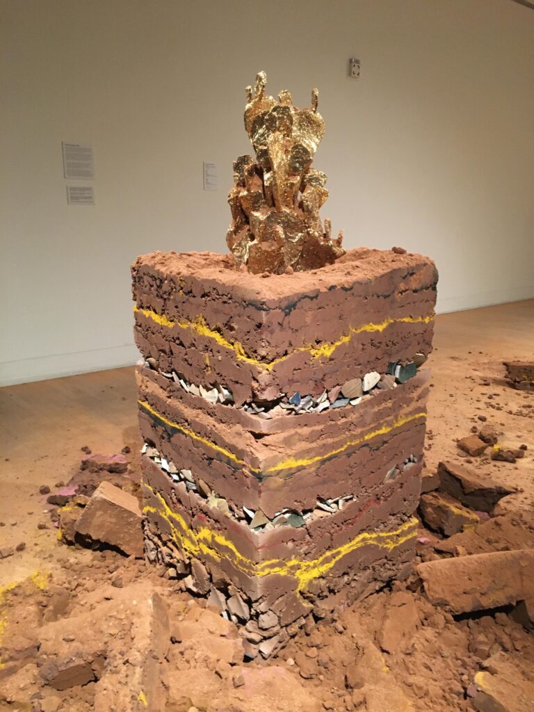 During the performance of ¿Y LA GENTE? Cortes excavates the rammed earth columns surrounded by musicians and dancers of his native Mexican heritage. Once revealing a gold ceramic sculpture within each column, one resembling a nopal cactus and the other a milling stone, Cortes exits the gallery leaving the deconstructed pillars to remain for the rest of the exhibition.